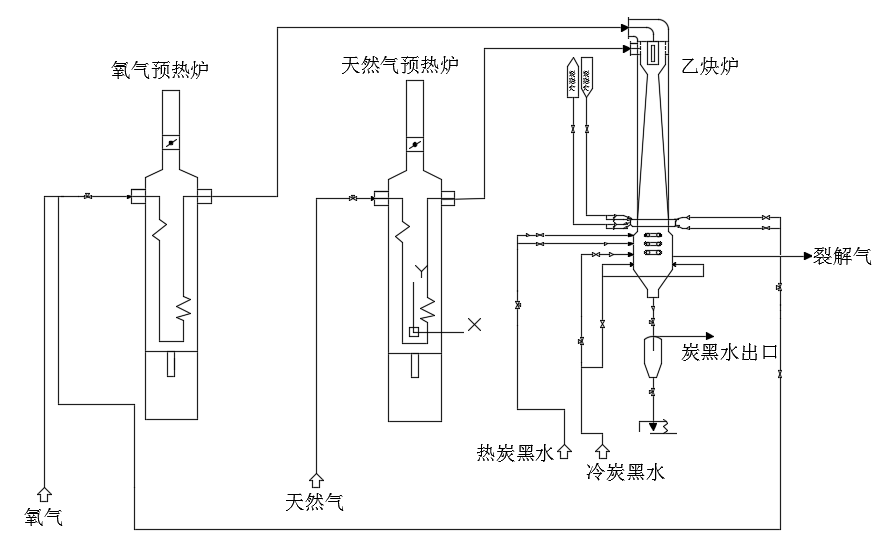 原料天然氣和氧氣在各自的預熱爐中加熱到600~650℃和大約0.135Mpa壓力下分別進入混合器,混合器是基于噴射器的原理設計,氧氣通過中心噴嘴噴入混合腔,噴嘴周圍是環形截面的加料裝置。首先在混合腔發生混合,然后通過擴散段將壓力恢復到生產需要的壓力。在混合器中天然氣和氧氣的混合時間一定要短,不能超過火焰形成的誘導時間(0.02~0.03秒),否則混合區內將發生自燃著火,當混合點壓力急劇上升到9.8KPa時,自動儀表發出報警并將氧氣放空,放入氮氣滅火,火焰熄滅后停氮并恢復氧氣開車,這是乙炔裂解爐重要的安全措施。