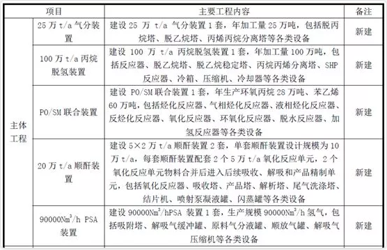 項目建設內容:主要建設1套25萬噸/年氣分裝置、1套100萬噸/年丙烷脫氫裝置、1套28/60萬噸/年PO/SM聯合裝置、2套5×2萬t/a順酐裝置和1套9000Nm3/hPSA裝置及配套的公輔工程和環保工程。