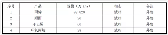 項目外售主要產品為聚合級丙烯、順酐、苯乙烯、環氧丙烷,外售副產品為碳四輕烴、輕芳烴、干氣、燃料油等。