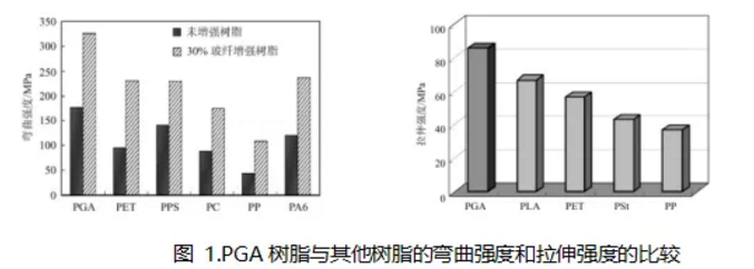 圖1列出了 PGA 樹脂與其它幾種常用合成樹脂的彎曲強度與拉伸強度的對比,表明了它是一種機械性能出色的合成樹脂,可配合多種其它高分子材料用于擠壓與射出成型。